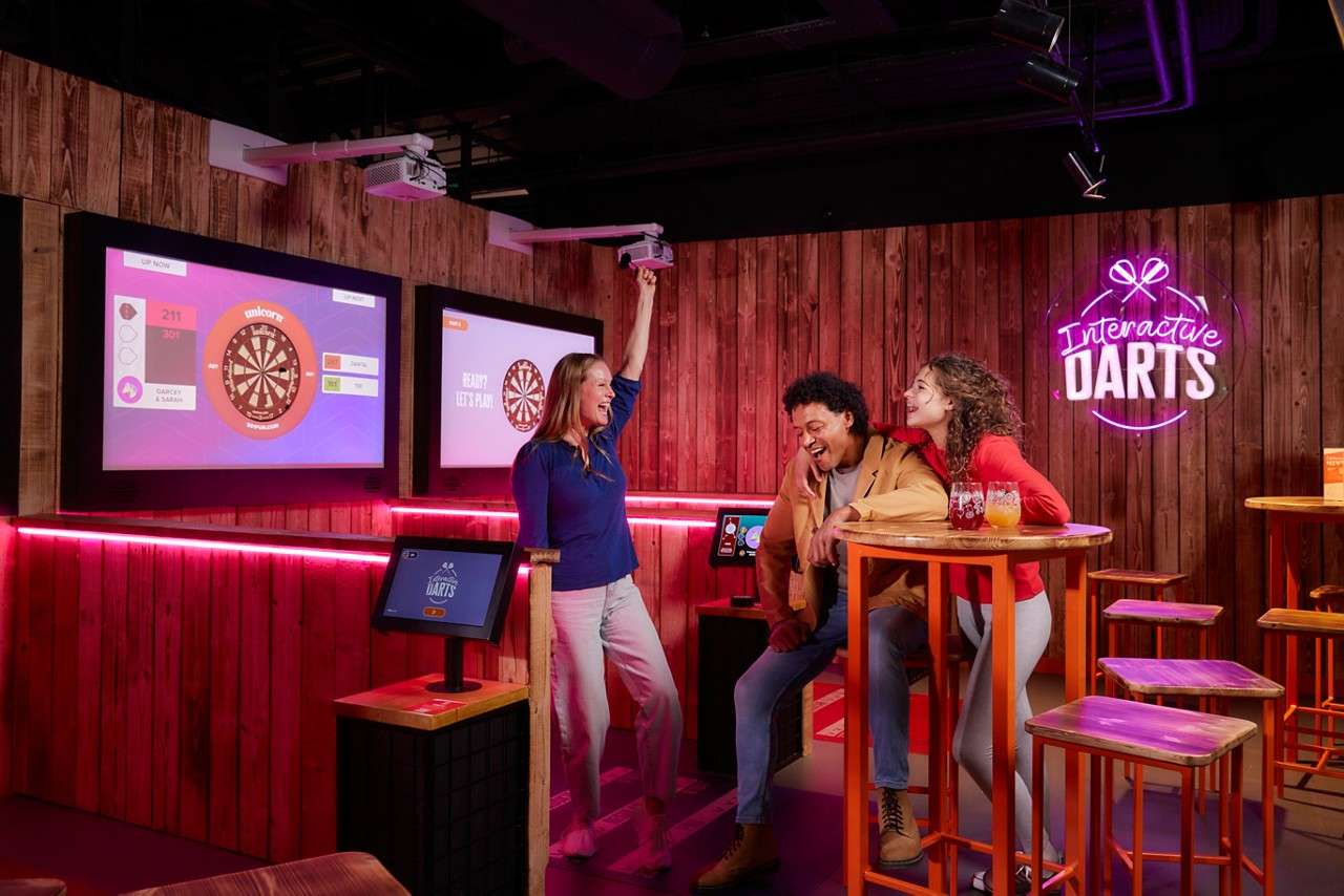 • Man aims a dart, preparing to throw; another person does the same in foreground; neon sign reads "Interactive DARTS" on wooden wall; screens and strip lights complete the arcade setting.