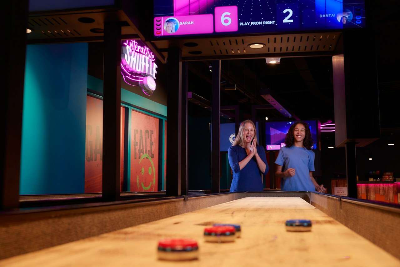 • Two women sit at a bar, chatting and drinking beer, while others socialize and play shuffleboard; neon, colorful lighting fills a modern arcade venue. Text: GET, GAME.