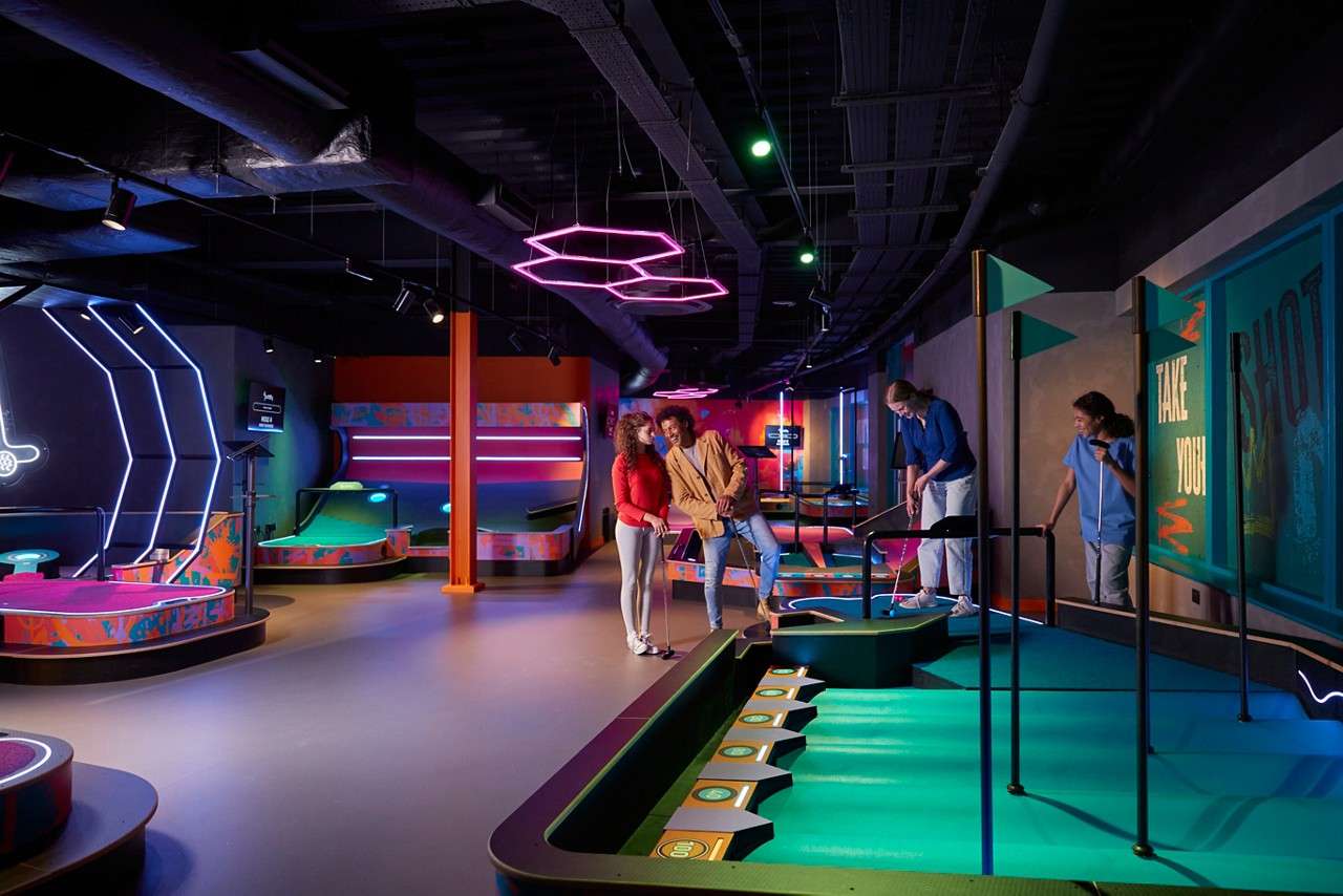• Golfer bends to putt while two friends watch and hold drinks in a neon-lit indoor mini-golf venue, beside a touchscreen stand holding a beer. Text visible: SHOT; puttify.